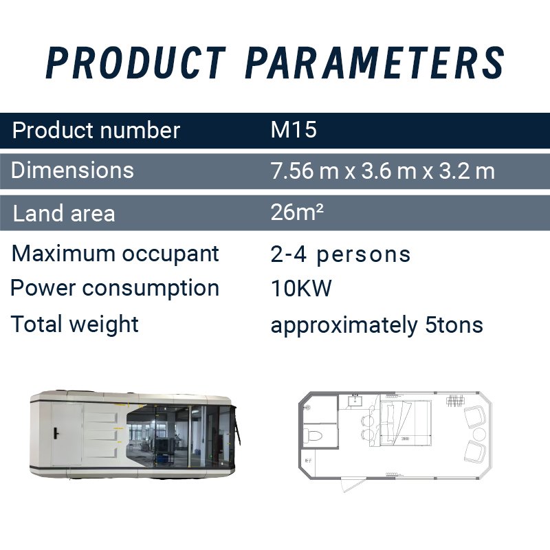 Discover the M15 (26m²), our panoramic prefab studio pod. This luxury, self-contained unit features a full bathroom and wide-body design for high-end accommodation.