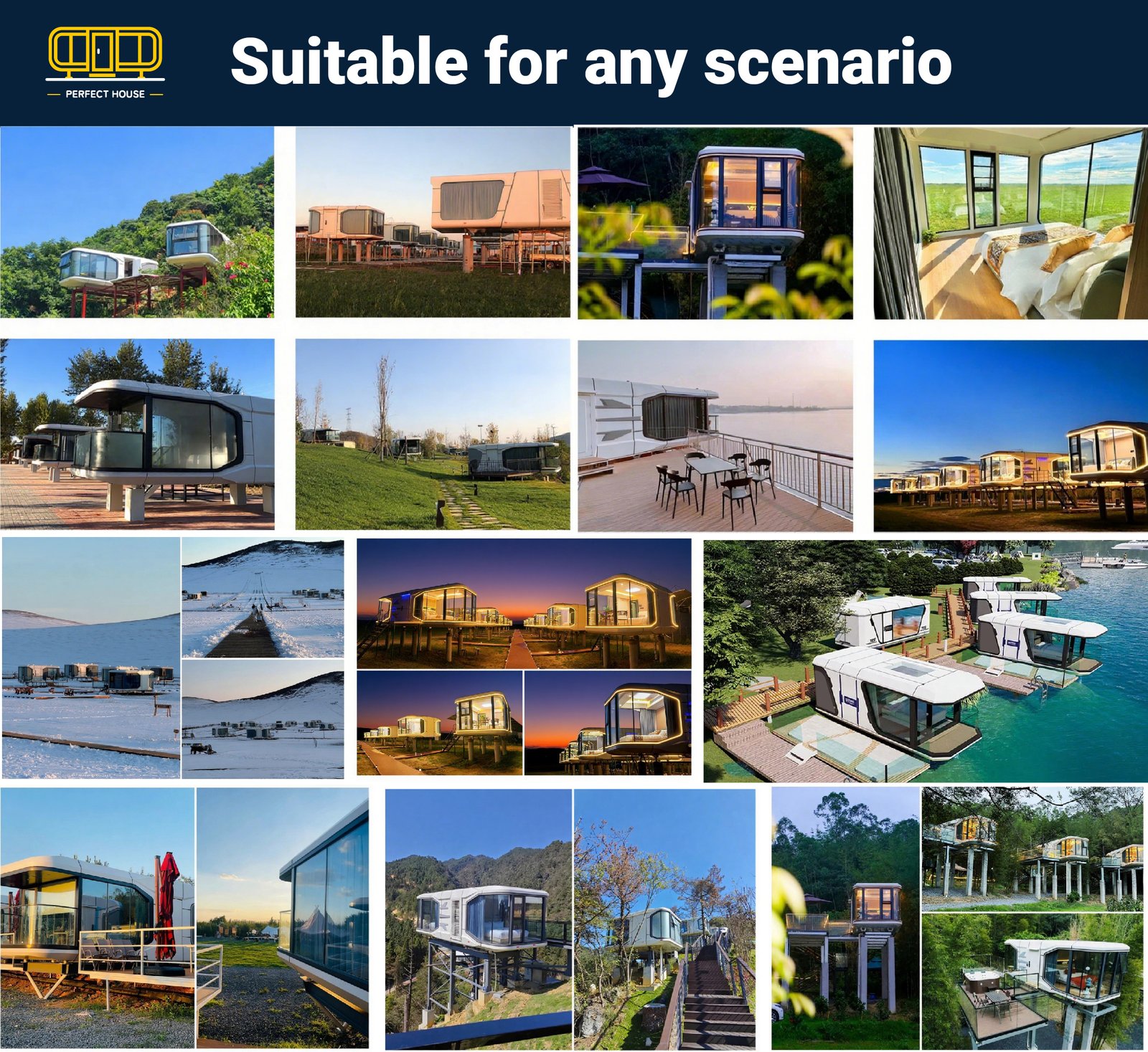 Discover the S05 (30m²), our luxury prefab suite featuring a stunning panoramic glass facade and a seamless, integrated balcony. This turnkey capsule comes fully equipped with a kitchen, full bathroom, and smart home controls, making it the ultimate solution for a high-end resort, glamping pod, or luxury personal retreat.