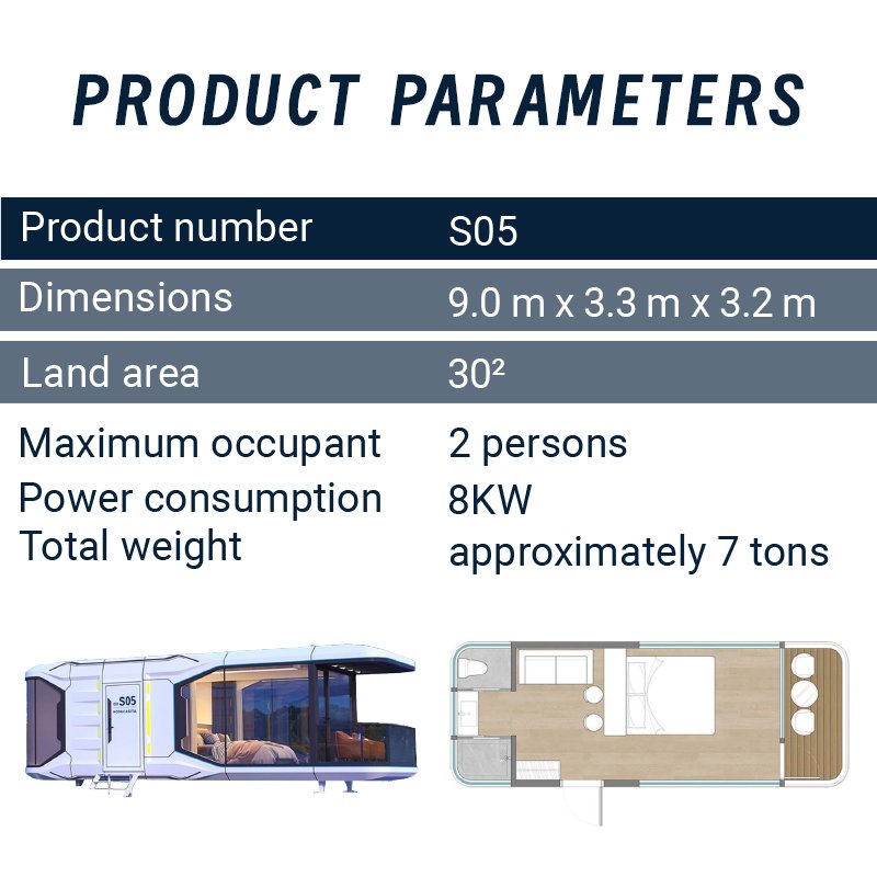 Experience the S05 (30m²), our stunning panoramic space capsule, complete with an integrated balcony for seamless indoor-outdoor living.