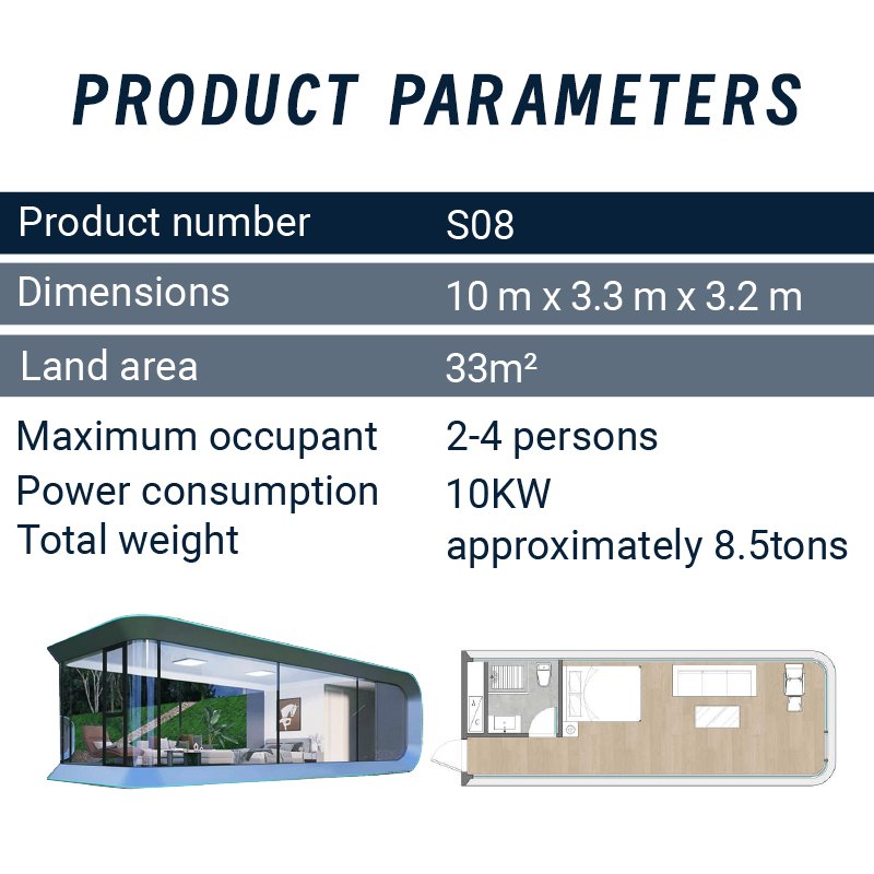 Discover the S08 (33m²), our self-contained panoramic space capsule, featuring a full 1-bedroom, 1-living room, and 1-bathroom layout.