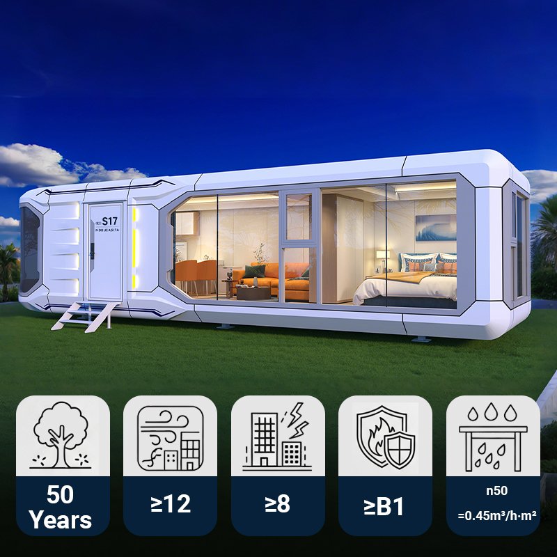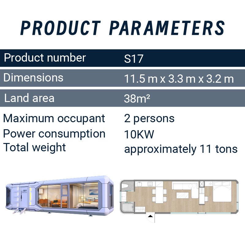 Discover the S17 (38m²), our unique dual-lounge space capsule. Featuring panoramic glass walls in both the living room and bedroom, plus a full kitchen and bath, this smart prefab home is the ultimate turnkey solution for luxury resorts, high-end rentals, or a breathtaking personal residence.