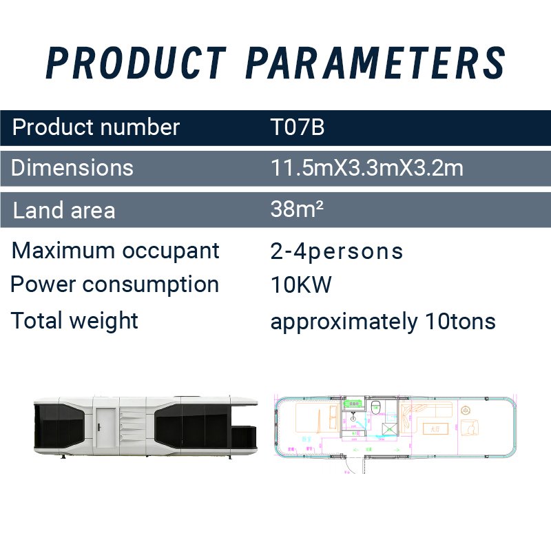 Discover the T07B (38m²), our expansive 1-bedroom luxury space capsule. Featuring a separate bedroom, full living room, kitchenette, and panoramic lounge, this smart prefab home is the ultimate turnkey solution for a high-end guest suite, personal residence, or luxury rental property.