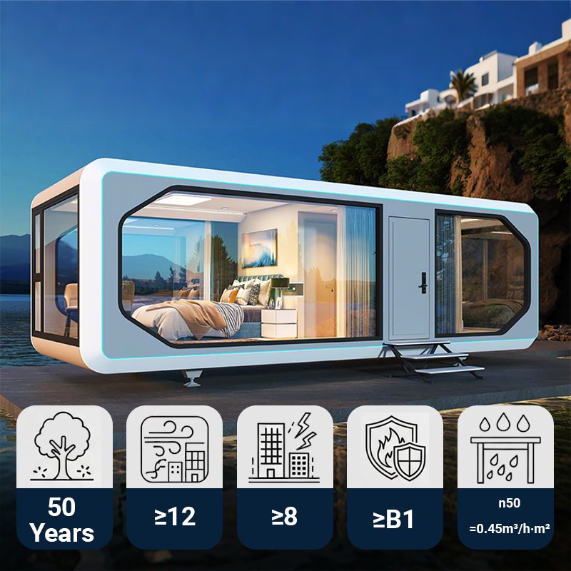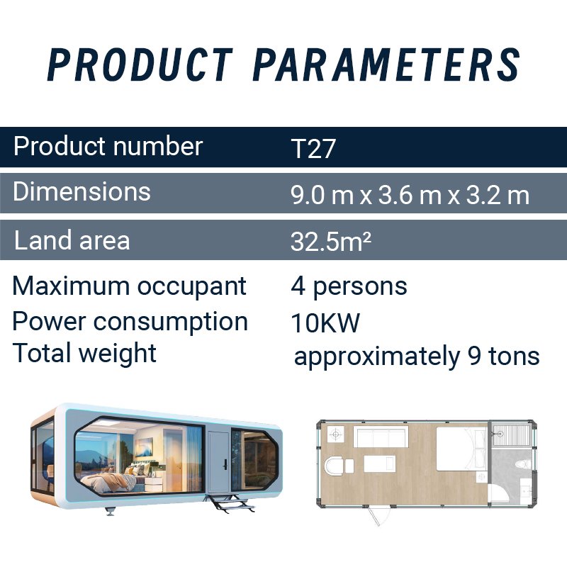 Discover the T27 (32.5m²), our spacious 3.6m wide-body smart capsule. Featuring a separate 1-bedroom and 1-living room layout, this prefab pod is the perfect turnkey solution for a modern guest house, luxury rental unit, or private home office, complete with smart home technology.